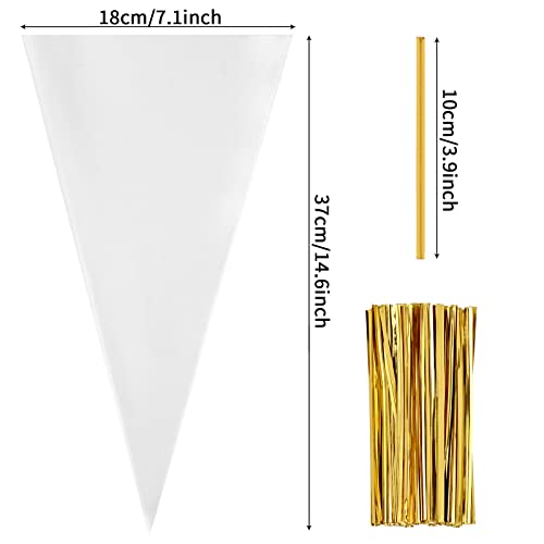 Feeona 100 Pezzi Cono Trasparente Caramelle Borse 18x37cm con 100 Pezzi Oro Legami di Torsione,Bustine Trasparenti Sacchetti per Alimenti Dolci Sacchettini Regali Sacchetti trasparenti.