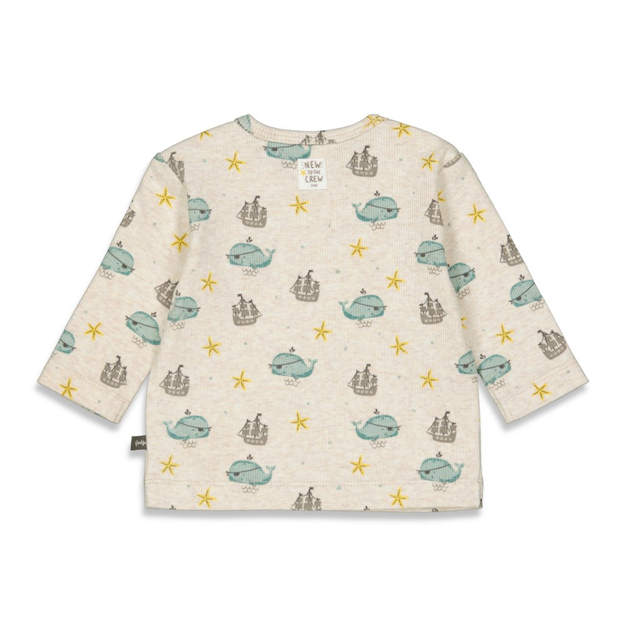 Dettagli del prodotto: Camicia a maniche lunghe a coste Collo rotondo Premi i tacchetti su una spalla Allover print Polsini morbidi Materiale e cura: Materiale: 95% cotone organico, 5% elastan Lavabile fino a 40 °C Non adatto all'asciugatrice Appendere ad asciugare Non stirare a caldo
