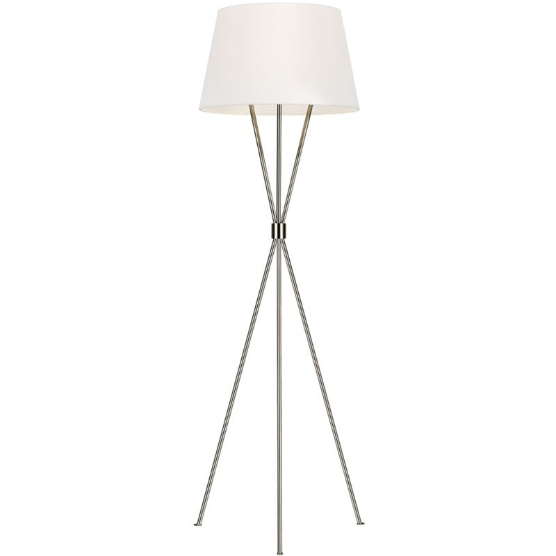 Collezione Penny METALLO SENZA TEMPO Lampada da terra a 1 luce - Nichel lucido. Le lampade da terra Penny sono senza tempo ed eleganti, con una base a treppiede ispirata alla metà del secolo e gambe allungate che si incontrano in un punto studiato su misura. Le lampade da terra Penny includono un paralume in tessuto bianco.