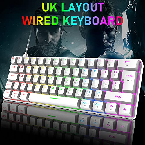 【Tastiera Meccanica da Gioco al 60%】 La mini tastiera da gioco cablata al 60% adotta un design compatto a 62 tasti, leggero, di piccole dimensioni, semplice nell'aspetto e comodo da usare. Lascia che la tua scrivania liberi più spazio per spostare il mouse o posizionare altre apparecchiature. La tastiera è plug and play per una connessione affidabile. È QWERTY UK Layout.