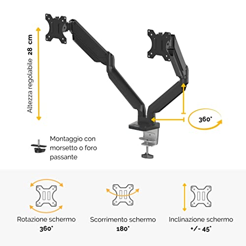 TECNOLOGIA A MOLLE A GAS: Braccio monitor completamente regolabile senza fatica che può oscillare di 180°, inclinarsi di +85°/-15° e permette la rotazione dello schermo di 360° grazie alle molle a gas