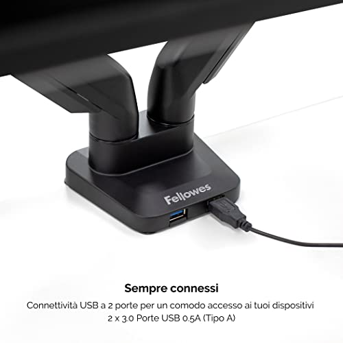 Fellowes Braccio monitor doppio Platinum Series, regolabile con molle a gas, attacco VESA 75x75 e 100x100, 2 porte USB integrate, per monitor fino a 32" e 8 kg, colore nero