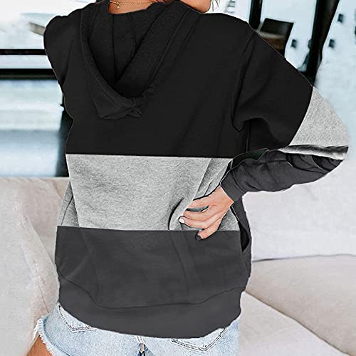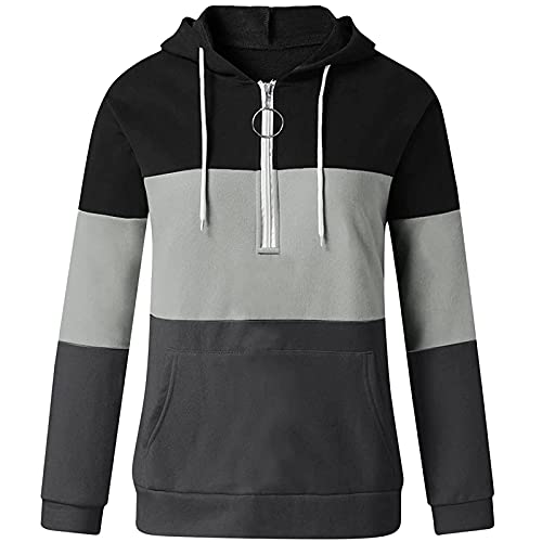 Felpa con cappuccio da donna, patchwork, con cappuccio, casual, con chiusura lampo, con cappuccio, a maniche lunghe, con tasche, Nero, XL