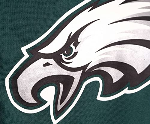 Esclusiva felpa con cappuccio della squadra di football americano Philadelphia Eagles, colore verde della squadra originale con logo aquila stampato sul davanti, logo NFL Shield ricamato sulla bandiera destra e di New Era sulla manica sinistra.