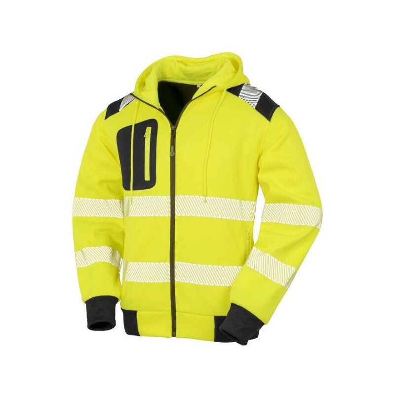 Caratteristiche: Ampia cerniera YKK con mentoniera e linguetta Sposa costina su polsini e vita Fasce elastiche di sicurezza stampate Tasche frontali e sul petto con zip Cappuccio regolabile con cordino Antivento e traspirante Materiali: 100% poliestere riciclato REPREVE® certificato GRS. Interno in felpa garzata Costa: 100% poliestere. 280 g/mq Standard: EN ISO 20471: 2013 + A1: 2016 classe 2