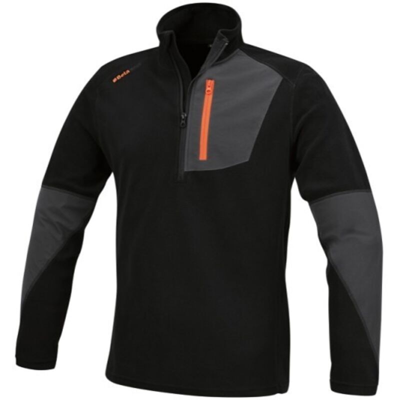 In 95% poliestere, 5% spandex, 180 gr. polsini elasticizzati, tasca al petto con chiusura zip verticale, inserti in poliestere su tasca petto e maniche. colore nero.l