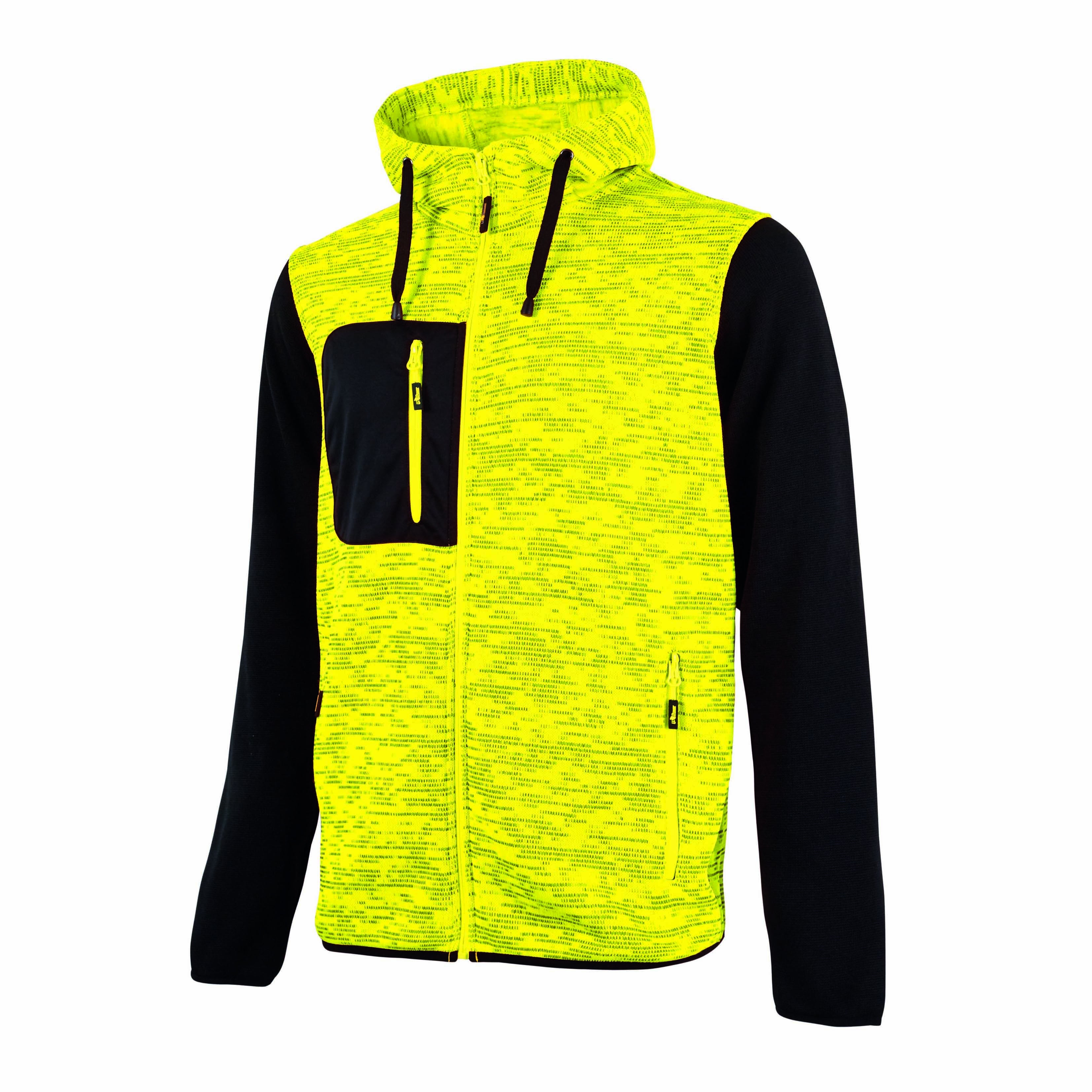 Felpa full-zip con interno in morbido pile. Colletto alto. Chiusura centrale con zip. Polsi e fondo in tessuto elasticizzato. Logo U-Power “testa di leone” tono su tono applicato su braccio destro.. Cappuccio fisso regolabile.. Due tasche frontali e una tasca sul petto chiuse con zip.
