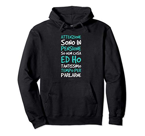 Design Felpa: Attenzione sono in pensione so ogni cosa ed ho tantissimo tempo per parlarne. Felpe con cappuccio sulla pensione con scritte divertenti e frasi originali, ironiche e simpatiche. Felpe per uomo e ragazzo.