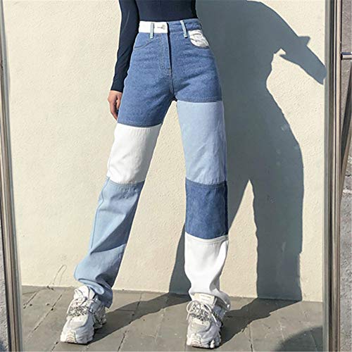 FeMereina Pantaloni Patchwork Jeans Dritti Donna Pantaloni a Vita Alta con Toppe in Denim Pantaloni Coreani con Cuciture a Gamba Larga Jeans con Cuciture a Contrasto con Tasche (Blu e Bianco, L)