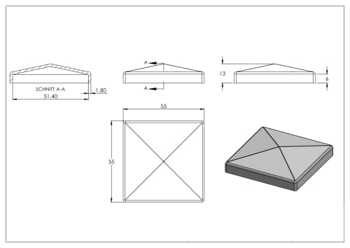 Fenau | copritestina/cappellotto | per tubo quadrato | dimensioni: 50x50 mm | acciaio S235JR, grezzo