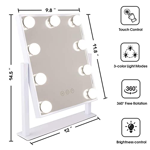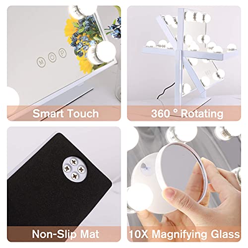 FENCHILIN Specchio trucco cosmetico con luci regolabile a 360 gradi a 9 lampade LED Touch Screen, Hollywood, grande da tavolo 10x ingrandente 25x30cm
