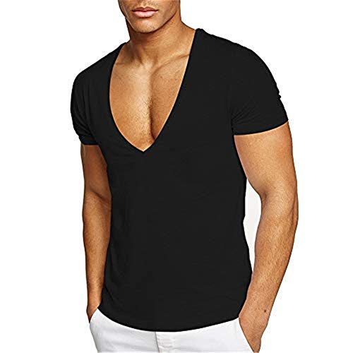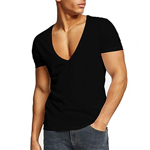 FengCheng Maglietta da uomo a tinta unita con scollo a V extra profondo, slim fit, scollo a V, elasticizzata, tinta unita, 65% cotone e 35% elastan, Nero, M
