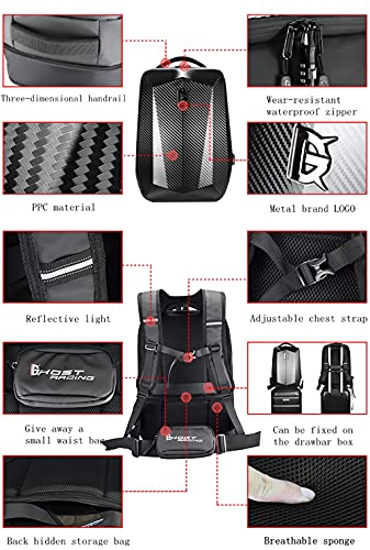 Sicuro: realizzato in poliestere Oxford di alta qualità, resistente all'acqua e all'usura, con un guscio rigido con fibra di carbonio. Copertura antipioggia integrata per proteggere l'acqua doppia in caso di pioggia forte. Lo zaino è dotato di una perfetta tenuta e stabilità grazie alle cinghie regolabili sul petto e in vita. Le fasce riflettenti sono progettate per rendere la guida di notte più sicura.