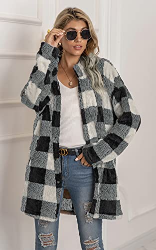 FEOYA Cappotti a Quadri Giacca Donna Elegante Pelliccia Giacca Calda Felpa a Maniche Lunghe con Tasche Di Capispalla Cardigan Autunno Casual Bianco