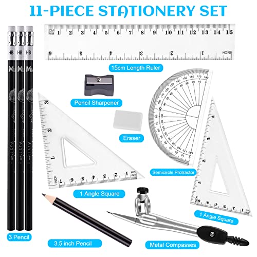 FEPITO 11 Pezzi Set di Bussole per Geometria Matematica Set di Goniometri per Studenti per Studenti Set di Cancelleria per Scuola Incluso Righelli, Matita, Gomma Nella Custodia
