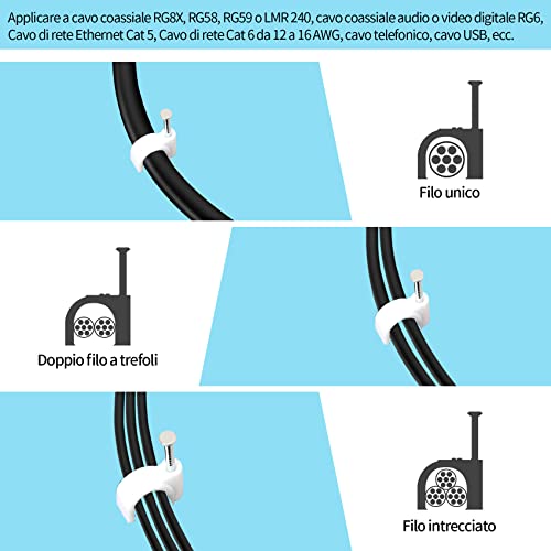 [AMPIO UTILIZZO] I fermacavi perfetti per cavo coassiale RG8X, RG58, RG59 o LMR 240, cavo coassiale audio o video digitale RG6, cavo di rete Ethernet Cat 5, Cat 6, cavo per altoparlanti da 12 a 16 AWG, cavo telefonico, cavo USB, ecc. Rendi la tua casa più ordinata e libera molto spazio. I fermacavi possono anche migliorare la sicurezza dell'uso dell'elettricità e proteggere la sicurezza dei membri della famiglia, in particolare dei bambini.