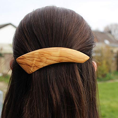 Questo fermaglio per capelli fatto a mano è realizzato in legno d'ulivo e un meccanismo a clip in metallo.