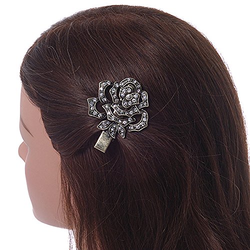 Fermaglio per capelli a clip, stile vintage, cristalli austriaci trasparenti, a forma di rosa, colore bronzo, larghezza 60 mm