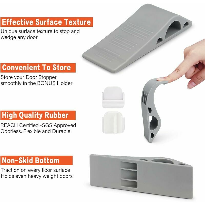 Il fermaporta è realizzato in gomma premium che ha caratteristiche di buona resistenza allo scivolamento, elevata elasticità e resistenza all'usura. Atossico e sicuro per durare Proteggi i tuoi pavimenti con questi fermaporta resistenti all'abrasione che non scivolano. Mantieni i tuoi bambini, neonati e animali domestici al sicuro dalle porte che sbattono.Il nostro cuneo fermaporta viene fornito con un retro adesivo facile da usare per riporre facilmente i fermaporta al sicuro fino alla prossima volta. Se sei bloccato con uno spazio più ampio, usa il cuneo porta multipack e semplicemente raddoppiarli. Il nostro fermaporta in gomma mantiene aperte anche le porte più pesanti.Con una presa potente, questo versatile fermaporta sul fondo della porta funziona su qualsiasi superficie, come cemento, moquette, pietra, mattoni, pavimenti in piastrelle, linoleum, perfetto per residenze e uffici, nonché uso industriale/commerciale.