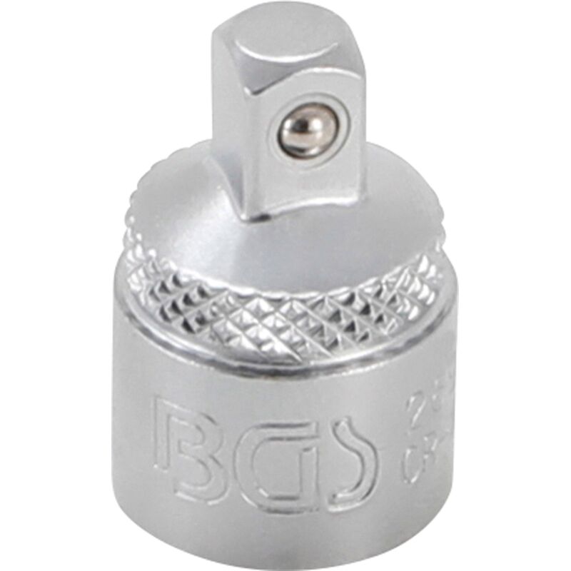 Bussola adattatore con attacco femmina da 3/8 a maschio 1/4. In acciaio cromo-vanadio finitura satinata. Lunghezza totale: 26 mm