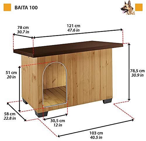 Ferplast Cuccia Cane da Esterno BAITA 100 in legno FSC, Piedini isolanti in plastica, Porta con antimorso in alluminio, Tetto apribile, 121 x 78 x h 78,5 cm