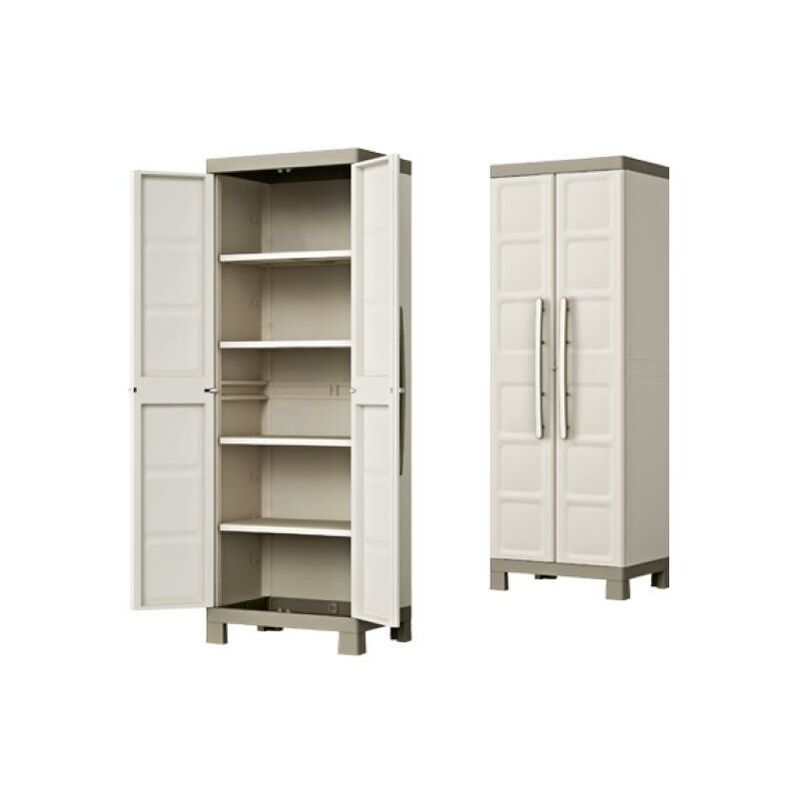 In polipropilene, resistente al gelo e alle intemperie, 2 ante, lucchettabile, 4 ripiani regolabili, piadini rialzati. Colore beige/grigio. Dimensioni 65x45xH182 cm.