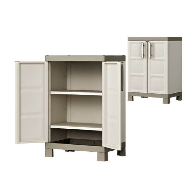 In polipropilene, resistente al gelo e alle intemperie, 2 ante, lucchettabile, 2 ripiani regolabili, piadini rialzati. Colore beige/grigio. Dimensioni 65x45xH97 cm.