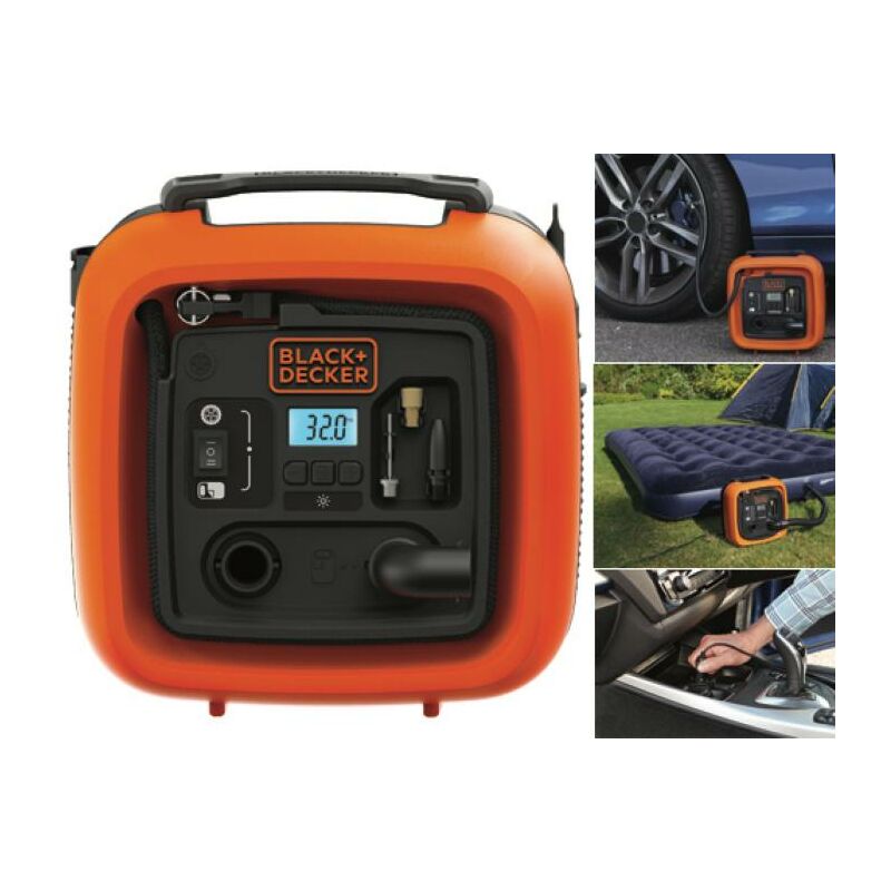 Funzionamento con presa accendisigari 12 Volt, porta per gonfiaggio ad alta pressione e per gonfiaggio ad elevato volume, display digitale e spegnimento automatico, max 160PSI - 11 Bar, funzione sgonfiaggio