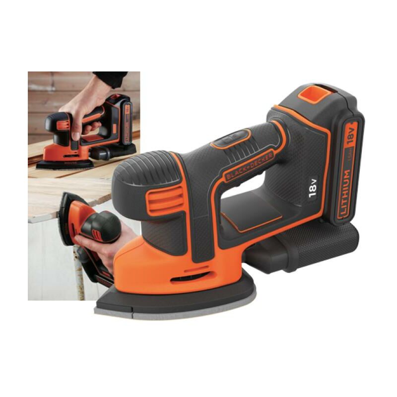 Batteria Litio 18 Volt - 1,5 Ah, velocita' 12.000 giri/min., 2 posizioni di lavoro, sistema raccolta polvere, puntale per levigatura dettagli