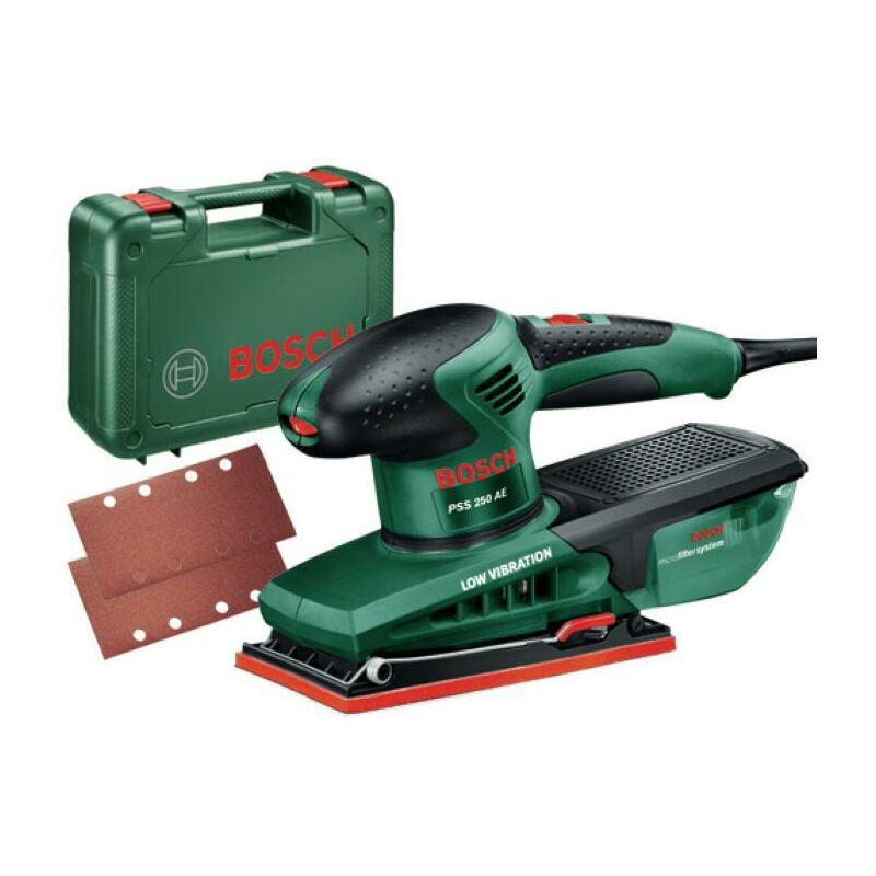 Potenza 250 Watt, piastra di levigatura 92x182 mm., no oscillazioni 24.000 giri/min., oscillazioni 2,0 mm., fissaggio foglio a pinza e microvelcro, rivestimento Softgrip, aspirazione polvere integrata con sistema Microfilter. Dotazione: Set 25 fogli abrasivi, valigetta
