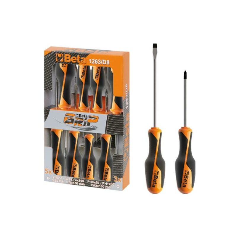 Serie di 8 pezzi per meccanico, l'impugnatura bimateriale ha vantaggi ergonomici sostanziali, la punta e' priva di cromatura ed e' protetta dall'ossidazione con un trattamento di fosfatazione. Pz. 5 per viti a testa con intaglio: mm. 2,5x60 - 3x75 - 4x100 - 5,5x125 - 6,5x150;