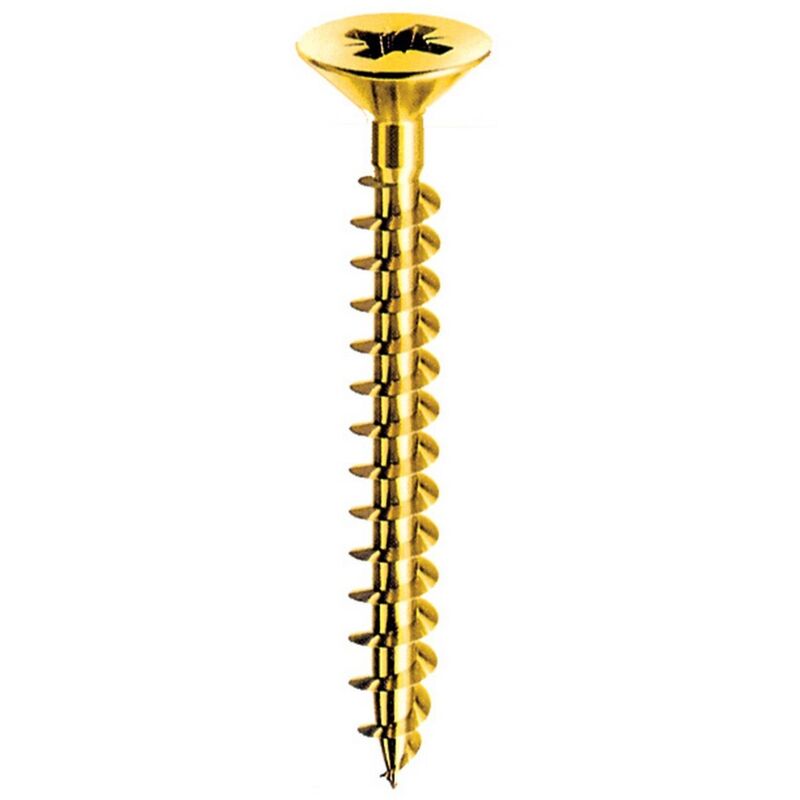 Vite universali a testa svasata piana adatta per l'avvitamento senza preforo su pannelli truciolari, legni naturali duri e teneri, materiali termoplastici, lamiere sottili. 4x20 mm. Ottonata Lucida