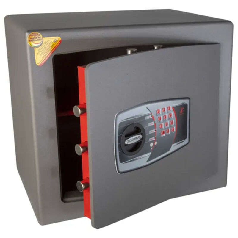 Cassaforte a mobile della Technomax, appartenente alla linea Technofort Moby Trony con certificazione S2 modello DMT/6-S2P Cassaforte con apertura a combinazione elettronica digitale Caratteristiche tecniche: Serratura certificata UNI EN 1300 controllata da un congegno elettronico ad alta affidabilità, dotato di memoria non-volatile. Apertura/chiusura con manopola di comando e blocco con elettromagnete. Alimentazione interna con batterie alcaline (non incluse). Tastiera a membrana con 4 leds dedicati. Contatti per batteria esterna ricavati direttamente sulla tastiera. Segnalazioni sonore e visive per conferma digitazione, errori e batterie interne in fase di esaurimento. Catenacci in acciaio nichelato, girevoli, Ø 22 mm. Protezione al meccanismo della serratura con piastra in acciaio al manganese. Elettromagnete protetto con speciali piastrine antitaglio. Catenacci orizzontali e verticali superiori protetti da una piastra in acciaio al manganese dello spessore di 3 mm., posizionata in