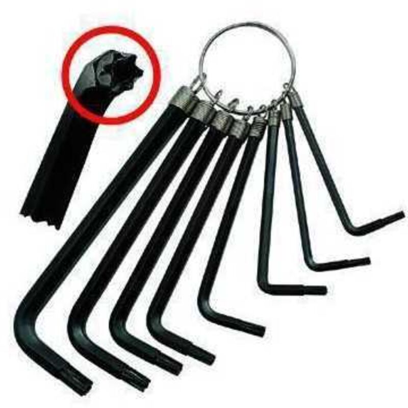 Serie di chiavi a brugola a impronta torx con foro centrale interno composta dalle misure t9 - t10 - t15 - t20 - t25 - t27 - t30 - t40, con anello Tipologia - Set Marca - Blinky Modello - 3597210 Peso - 175 g Quantità - 8