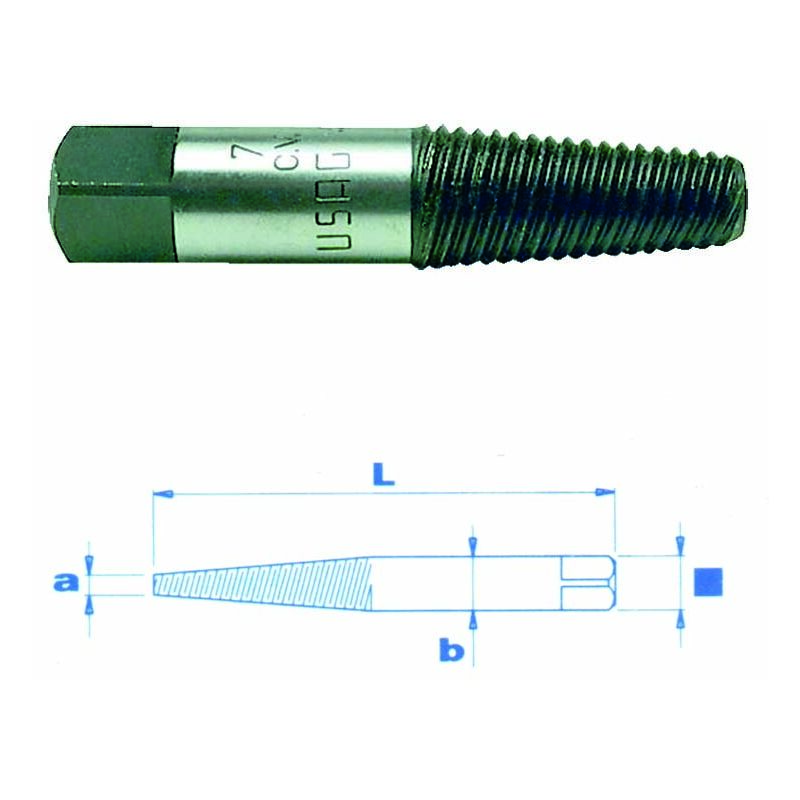 Foro 4,5 mm Dimensioni (vedi disegno): a 3,1 mm b 6,5 mm l 64 mm Estrattori conici in acciaio al cromo-vanadio per viti e prigionieri spezzati che non offrono alcuna possibilità di presa.