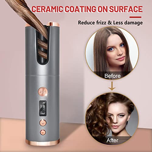 Ferro arricciacapelli automatico senza fili, con display LCD, temperatura regolabile e timer, bigodino portatile in ceramica, ricarica USB e ricaricabile (Grigio)