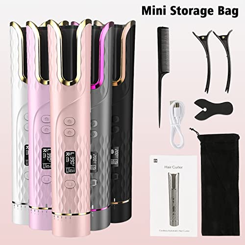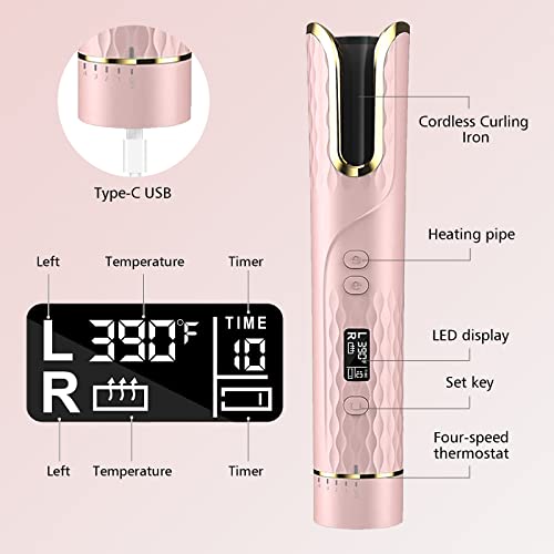 Ferro Arricciacapelli Automatico, Arricciacapelli Automatico Senza Fili, 4 Temperature Regolabili con Display LCD, Ferro Arricciacapelli Rotante in Ceramica Portatile Ricaricabile (Pink)
