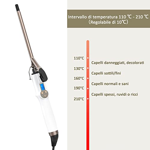 Ferro Arricciacapelli 9mm: Bigodino professionale con display LCD 110°C -130°C per capelli danneggiati, decolorati, 130°C - 160°C per capelli sottili/fini, 160°C - 190°C capelli normali, sani, 190°C - Capelli spessi, ruvidi o ricci a 210°C. Ferro arricciacapelli in ceramica 30s temperatura di riscaldamento rapido regolabile con il fusto in ceramica sottile da 9 mm e cavo di alimentazione girevole a 360° da 1,8 m.