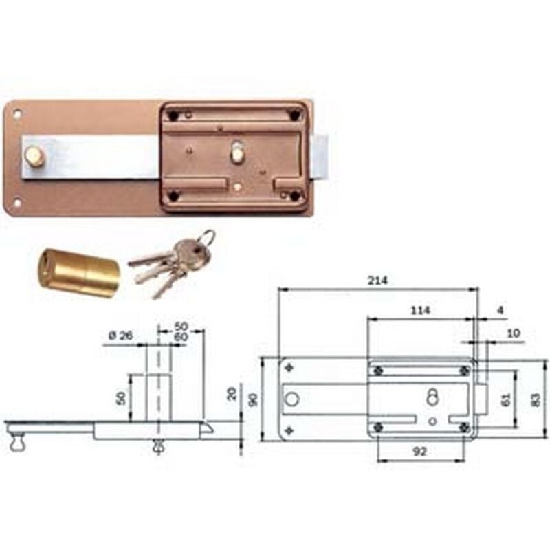 Serratura da applicare per porte in ferro con pomolo dblocca catenaccio interno e cilindro fisso ? mm.26x50 esterno - 3 chiavi - catenaccio a 5 mandate + scrocco incorporato - senza contropiastra