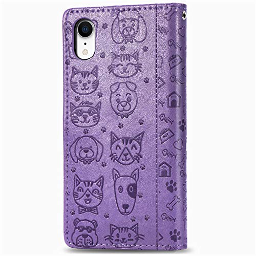 Fertuo Cover iPhone XR, Custodia Portafoglio a Libro in Pelle Flip Cover con Porta Carte, Chiusura Magnetica [Disegni di Gatto Cane] Case Antiurto per Apple iPhone XR, Viola