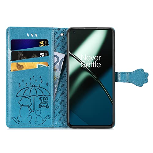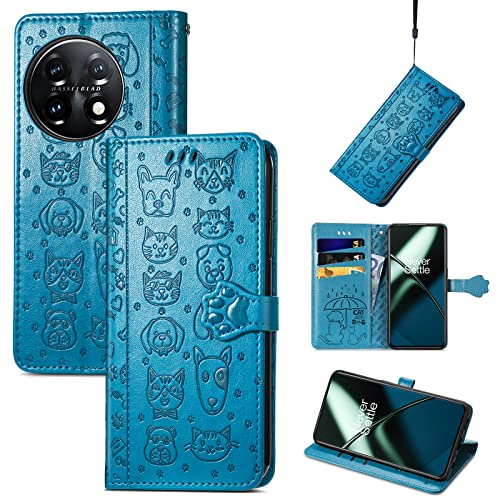 Fertuo Cover per Oneplus 11 5G, Custodia Portafoglio a Libro in Pelle Flip Cover con Porta Carte, Chiusura Magnetica [Disegni di Gatto Cane] Case Antiurto per Oneplus 11 5G, Blu