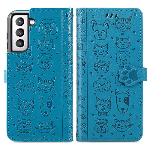 Fertuo Cover per Samsung S21, Custodia Portafoglio a Libro in Pelle Flip Cover con Porta Carte, Chiusura Magnetica [Disegni di Gatto Cane] Case Antiurto per Samsung Galaxy S21, Blu