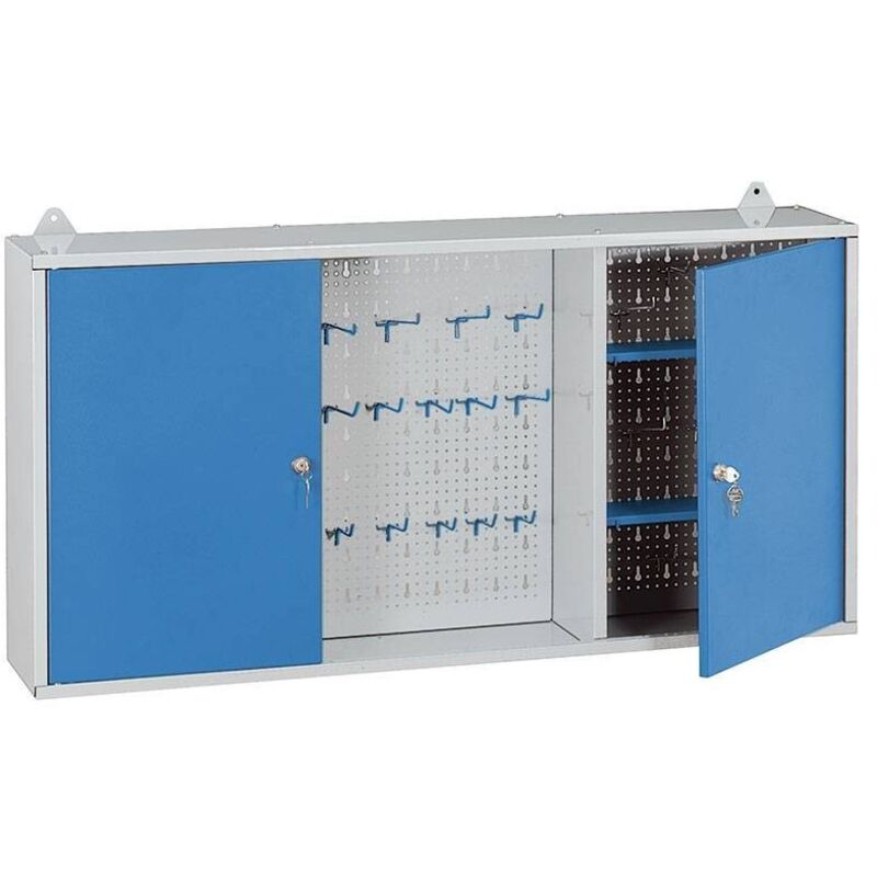 Caratteristiche tecniche: Dimensioni armadietto 1200 x 200 x 600h mm Spessore lamiera 0,8 mm Ripiani interni 4 Ganci 18 (6 + 6 + 6) Interasse fori 30 mm Peso netto 17 kg