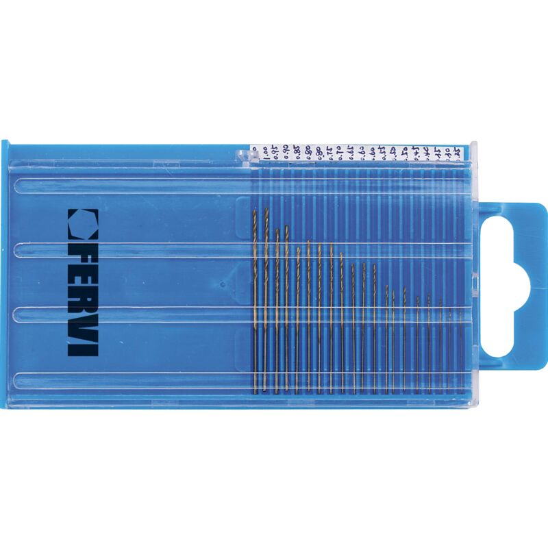 Materiale di produzione acciaio super rapido (HSS). Le punte sono rivestite con nitrato di titanio e La cima delle punte è affilata con un angolo 135°. Gli utensili, in totale 20 pezzi, vengono forniti in una scatola di plastica compatta e resistente.