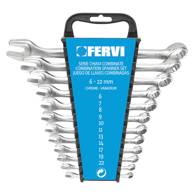 SERIE DI CHIAVI COMBINATE FERVI 0546 12 Pz Cr-V Satinata Serie: 6 ÷ 22 mm Pezzi: 12 Misure: 6 - 7 - 8 - 9 - 10 - 11 - 12 - 13 - 14 - 17 - 19 - 22 mm