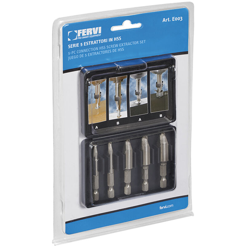 NUOVO SET DI ESTRATTORI PER VITI CON ATTACCO DA 1/4 Marca: FERVI Codice: E003 SET COMPOSTO DA: N° 0 = 2-3 mm. N° 1 = 4-5 mm. N° 2 = 6-8 mm. N° 3 = 8-10 mm. N° 4 = 10-12 mm