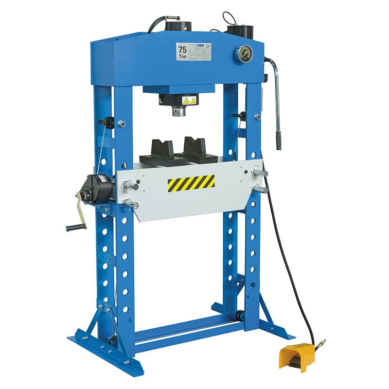 La pressa idraulica FERVI P001/75 è stata studiata e progettata per comprimere oggetti metallici oppure materiali assimilati ai metalli, rimuovere o installare meccanismi, supporti metallici, boccole, cuscinetti, snodi e pulegge. Può essere impiegata anche nei lavori di riparazione sui motori elettrici e le armature, nonché per piegature di metalli. Costruita in acciaio e verniciata a polvere per resistere a lungo nel tempo, questa pressa idraulica con manometro integrato può sopportare forze di pressatura di 75 tonnellate, il che la rende idonea per lavorazioni di medio-grande entità. La pressa idraulica 800VPG0983 è costituita di una trave portante sorretta da robuste colonne in acciaio e su cui monta il punzone mobile carrellato azionato da una pompa idraulica . Il bancale ove poggia il pezzo da lavorare è regolabile in altezza tramite apposito verricello posto lateralmente (vi sono 5 posizioni disponibili) in modo tale da consentire all'operatore di lavorare confortevolmente ed