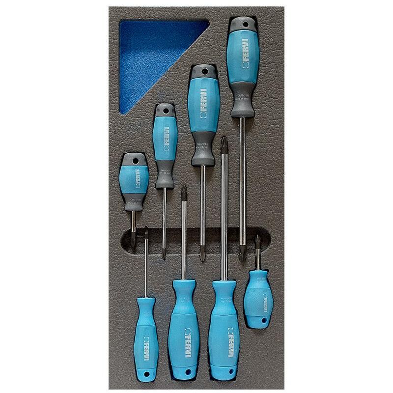 Termoformato morbido in polietilene espanso bicolor grigio-blu a 4 strati fresato con macchina cnc completo di utensili. Caratteristiche tecniche: MatCrV Finitura1 Cromata Pezzi 8 Pcs Dimensioni 188 x 405 x 33 mm Giravite a croce per meccanica PH 1 x 75 - PH 2 x 100 - PH 3 x150 - PH 2 x 38 mm Giravite a croce per viti da legno PZ 1 x 75 - PZ 2 x 100 - PZ 3 x 150 - PZ 2 x 38 mm Articoli inclusi C882/.. - C885/..