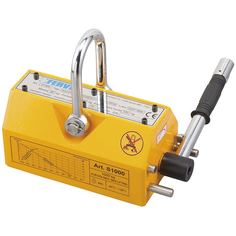 Il sollevatore magnetico FERVI S1000 è un sollevatore magnetico permanente a comando manuale atto alla movimentazione (sollevamento, traslazione e deposito) di materiale ferromagnetico tipo: lamiere, piatti, tondi ecc. di materiale ferroso comune. Il sollevatore sfrutta le proprietà dei magneti permanenti di creare un campo magnetico in grado di attrarre materiali ferrosi. L'attivazione viene eseguita per mezzo di una leva che fa ruotare un nucleo nel quale sono incorporati i magneti permanenti, così da ottenere un flusso magnetico che nella fase di lavoro attraversi il carico da manipolare e nella fase di rilascio si cortocircuiti all'interno del sollevatore stesso. Caratteristiche tecniche del supporto FERVI S1000 Portata max: 1000 kg Portata barre tonde: 330 kg Diametro min-max sollevabile: 75 ÷ 450 mm Dimensioni: 350 x 277 x 156 (B) mm Peso netto: 36 kg