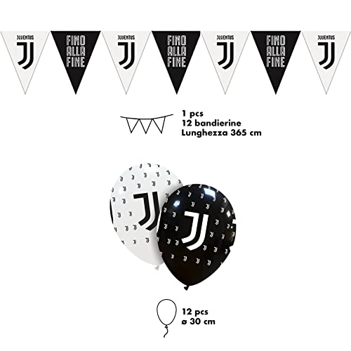 Lage Kit per Festa di Compleanno a Tema Juventus - Set per Decorazioni Calcio Bianconero da tavola Addobbi per 16 Persone (1 Tovaglia - 12 Palloncini - 16 Piatti - 20 Tovaglioli - 12 Bandierine)